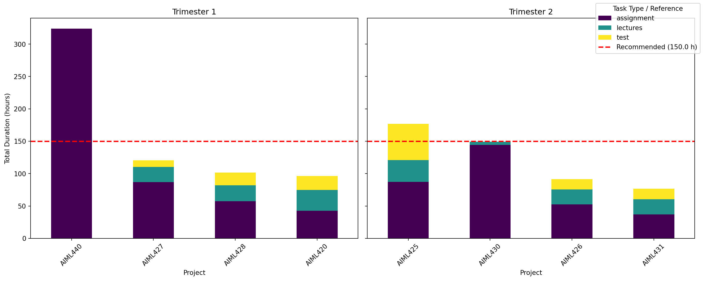 # Plot of time spent per paperimport matplotlib.pyplot as pltimport pandas as pdfrom matplotlib.patches import Patchtime_entries = pd.read_csv('processed_time_entries.csv')time_entries['duration'] = pd.to_timedelta(time_entries['duration'])def assignment_task_time(task): task = task.lower()if'assignment'in task or'project'in task or'reading'in task or'survey'in task or'capstone'in task or'seminar'in task:return"assignment"if'lecture'in task or'seminar notes'in task or'intro'in task:return"lectures"if'test'in task or'exam'in task or'term'in task:return"test"def get_time_by_task(time_entries):# Remove AIML440 as it is not coursework filtered_entries = time_entries[time_entries['project'] !='AIML440'].copy() filtered_entries.loc[:, 'task_type'] = filtered_entries['task'].apply(assignment_task_time)# Show none tasks that couldn't be classified missing_ones = filtered_entries[filtered_entries['task_type'].isna()]print(f"Ignoring {len(missing_ones)} entries without classified task type which is a total of {missing_ones['duration'].sum()}") time_by_task = filtered_entries.groupby(['project', 'task_type'])['duration'].sum() time_by_task_hours = time_by_task.dt.total_seconds() /3600return time_by_task_hours.sort_values(ascending=False)time_by_task_hours = get_time_by_task(time_entries)# add in AIML440 with all time as 'assignment'time_by_task_hours.loc[('AIML440', 'assignment')] = time_entries[time_entries['project'] =='AIML440']['duration'].sum().total_seconds() /3600# Get trimester for each projectproject_trimester = time_entries.groupby('project')['trimester'].first()project_trimester['AIML440'] ='T12025'# Assuming AIML440 is T1# Create subplots for each trimesterfig, axes = plt.subplots(1, 2, figsize=(15, 6), sharey=True)trimesters = ['T12025', 'T22025']titles = ['Trimester 1', 'Trimester 2']recommended_hours =150# 8.8 hours/week for 17 weeks ~= 150for ax, tri, title inzip(axes, trimesters, titles):# Filter projects for this trimester tri_projects = project_trimester[project_trimester == tri].index# Get data for these projects tri_data = time_by_task_hours.loc[tri_projects].unstack(fill_value=0)# Sort by total time descending tri_data = tri_data.loc[tri_data.sum(axis=1).sort_values(ascending=False).index]# Plot stacked bar tri_data.plot(kind='bar', stacked=True, ax=ax, colormap='viridis', legend=False) ax.set_title(title) ax.set_xlabel('Project') ax.set_ylabel('Total Duration (hours)') ax.tick_params(axis='x', rotation=45)# Horizontal line for recommended hours ax.axhline(y=recommended_hours, color='red', linestyle='--', linewidth=2)# Add legend to the figurehandles, labels = axes[0].get_legend_handles_labels()# Add the recommended line handlehandles.append(plt.Line2D([0], [0], color='red', linestyle='--', linewidth=2))labels.append(f'Recommended ({recommended_hours:.1f} h)')fig.legend(handles, labels, title='Task Type / Reference', loc='upper right')plt.tight_layout()plt.show()
